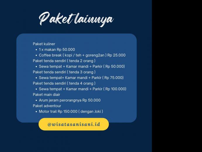 2. Paket wisata Camping, di desa Sani - Sani ada 3 lokasi untuk kita bisa menikmati wisata camping, 1 lokasi di pantai dan 2 lokasi lagi di puncak. Masing - masing lokasi camping ini menawarkan pengalaman yang berbeda.Suasana camping di area pantai kita bisa menikmati sunset yang sempurna dengan pemandangan lautnya dan gugusan pulau padamarang yang tepat berada di depan pantai, Kami berikan nama lokasi camping di pantai itu Sunset Beach Camp dengan kapasitas bisa menampung 50 tenda .