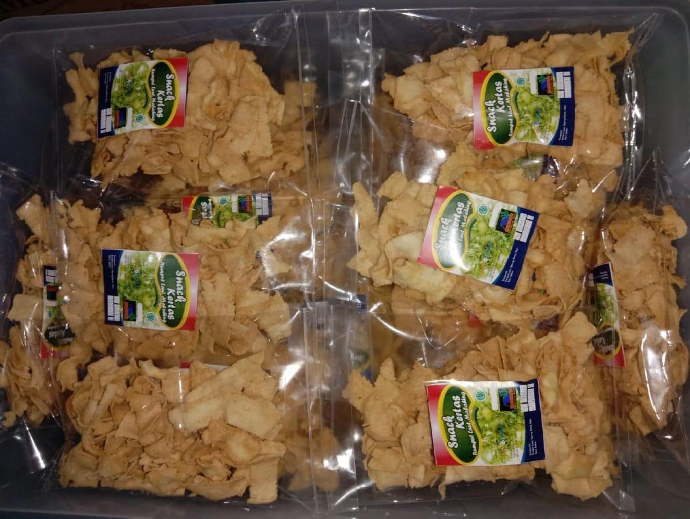 Snack Kertas juga tidak berbeda dengan kerupuk amplang ,yang dimana hasil olahan berdasarkan bahan baku rumput laut yang di olah menjadi cemilan ringan khas malahing dengan tujuan yang sama sebagai penigkatan ekonomi produktif masyarakat malahing